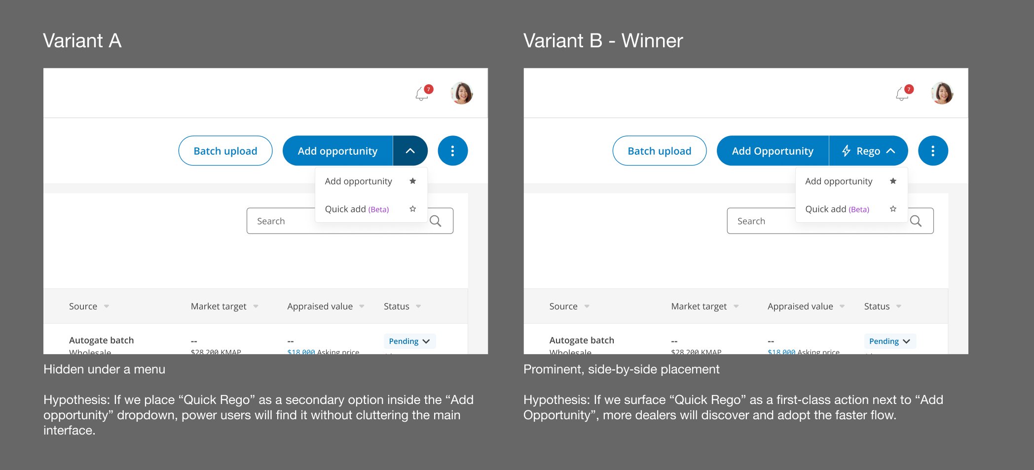 Hypothesis: If we surface “Quick Rego” as a first‑class action next to “Add Opportunity”, more dealers will discover and adopt the faster flow.